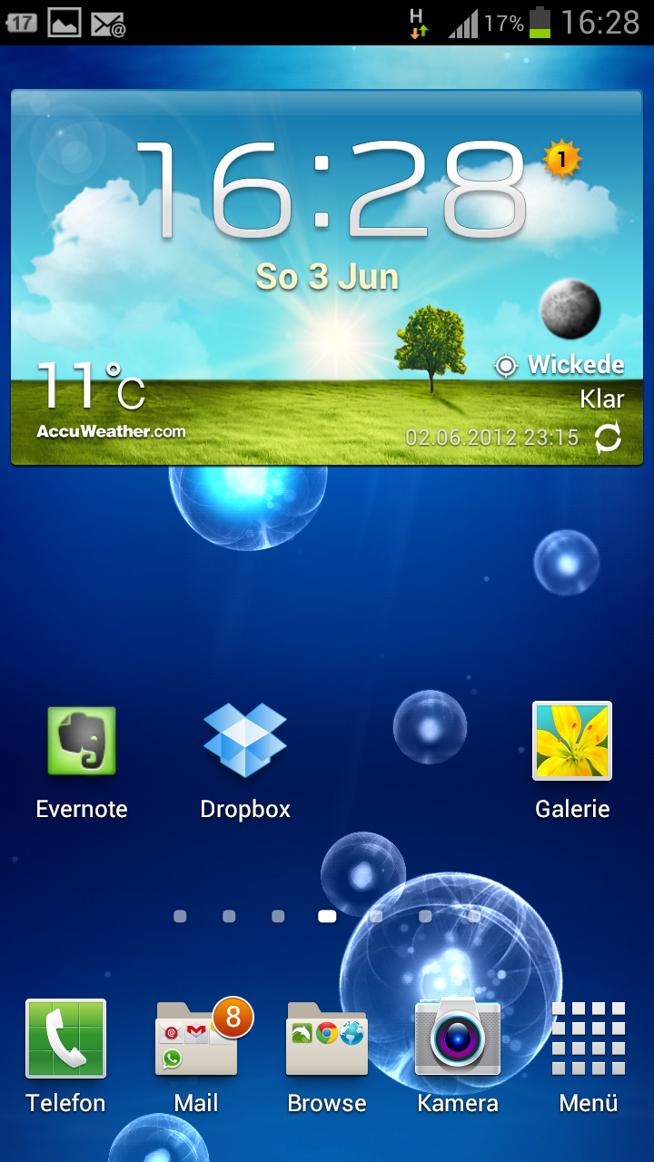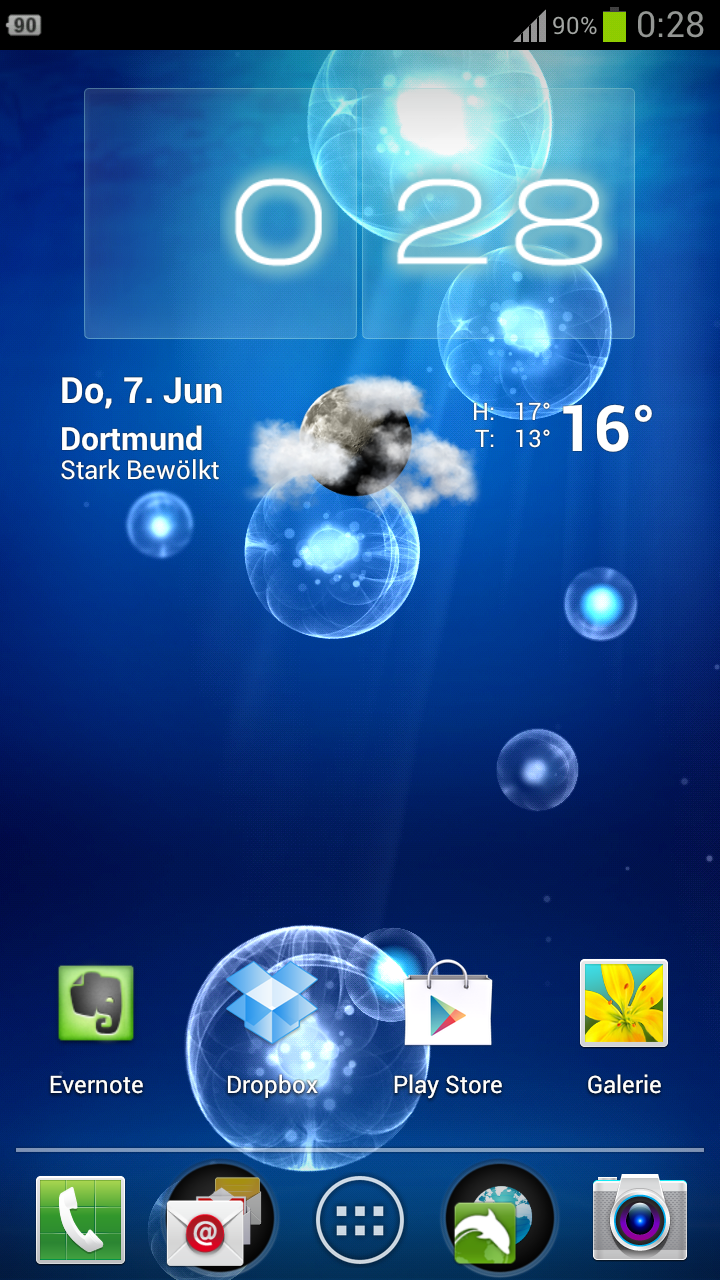2. Internes Energiemanagement: Auch ohne Aktivierung der Energiesparfunktion scheint Samsung hier auf Sparmaßnahmen geachtet zu haben. Mir ist aufgefallen, dass bei niedrigem Akkustand ein Livewallpaper plötzlich seine Bewegungen einstellt. Das spart natürlich Saft. Ab 20% friert das Wallpaper ein und wird erst wieder geweckt, wenn eine Stromquelle angeschlossen wird. Ich kann allerdings noch nicht sagen, ob das generell der Fall ist oder vielleicht an dem Samsung-eigenen Wallpaper „Tiefsee“ liegt, das ich momentan nutze.