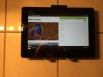 Die Firma XFLAT bietet mit seinem Up-System eine schöne Alternative. Ein runder, drehbarer Knauf wird mittels einer einzigen gedübelten Schraube an eine Wand angebracht. Das Tablet (ein 7,9″ iPad Mini passt genauso, wie der 10.1″ Androide) wird in ein Drei-Arm-Schienen-System mit einem herausziehbarem Arm eingeklemmt und dann einfach in den Knauf eingehakt.