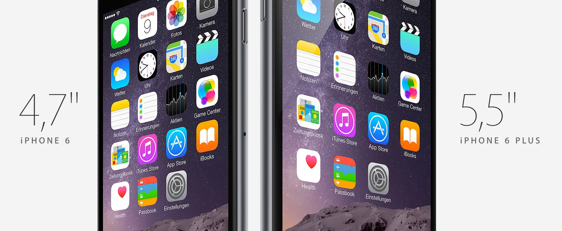 Apple präsentiert ein iPhone 6 mit 4,7″ Zoll Display bei einer Auflösung die etwas über HD liegt. Und ein iPhone 6Plus mit 5,5″ Display, das Full-HD bietet.