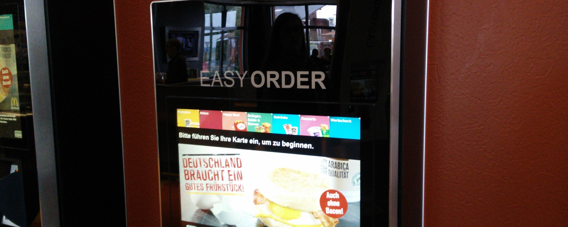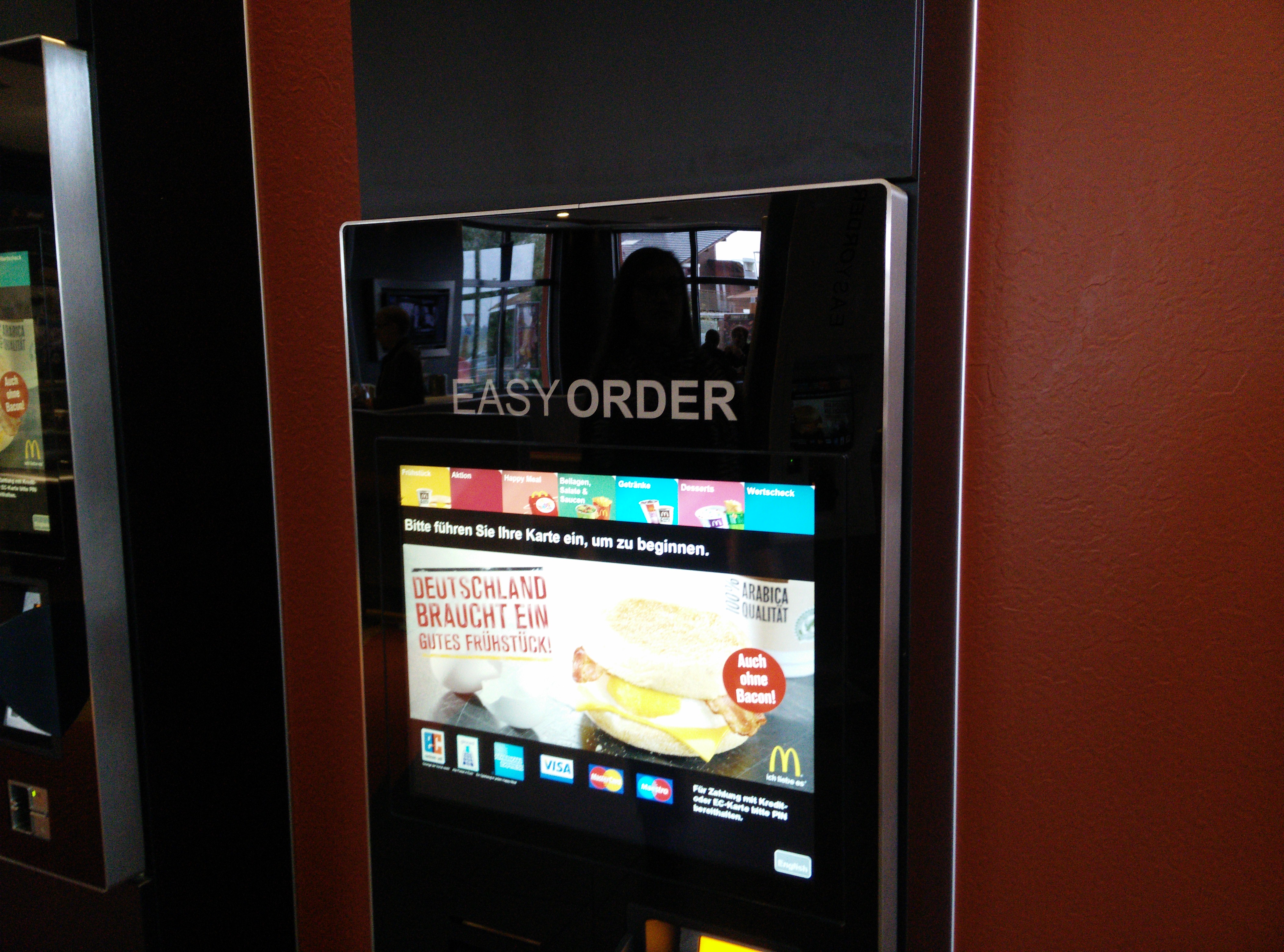 Doch kommen wir zur Wegrationalisierung des Personals. Ihr merkt schon: 6 Kassen waren es, drei sind es nur noch. Dafür stehen die Automaten „Easy Order“ dort. An denen kann man nämlich mit EC- und Kreditkarte bezahlen, wählt seine Bestellung aus, erhält die Nummer und wartet, bis seine Bestellung fertig ist.