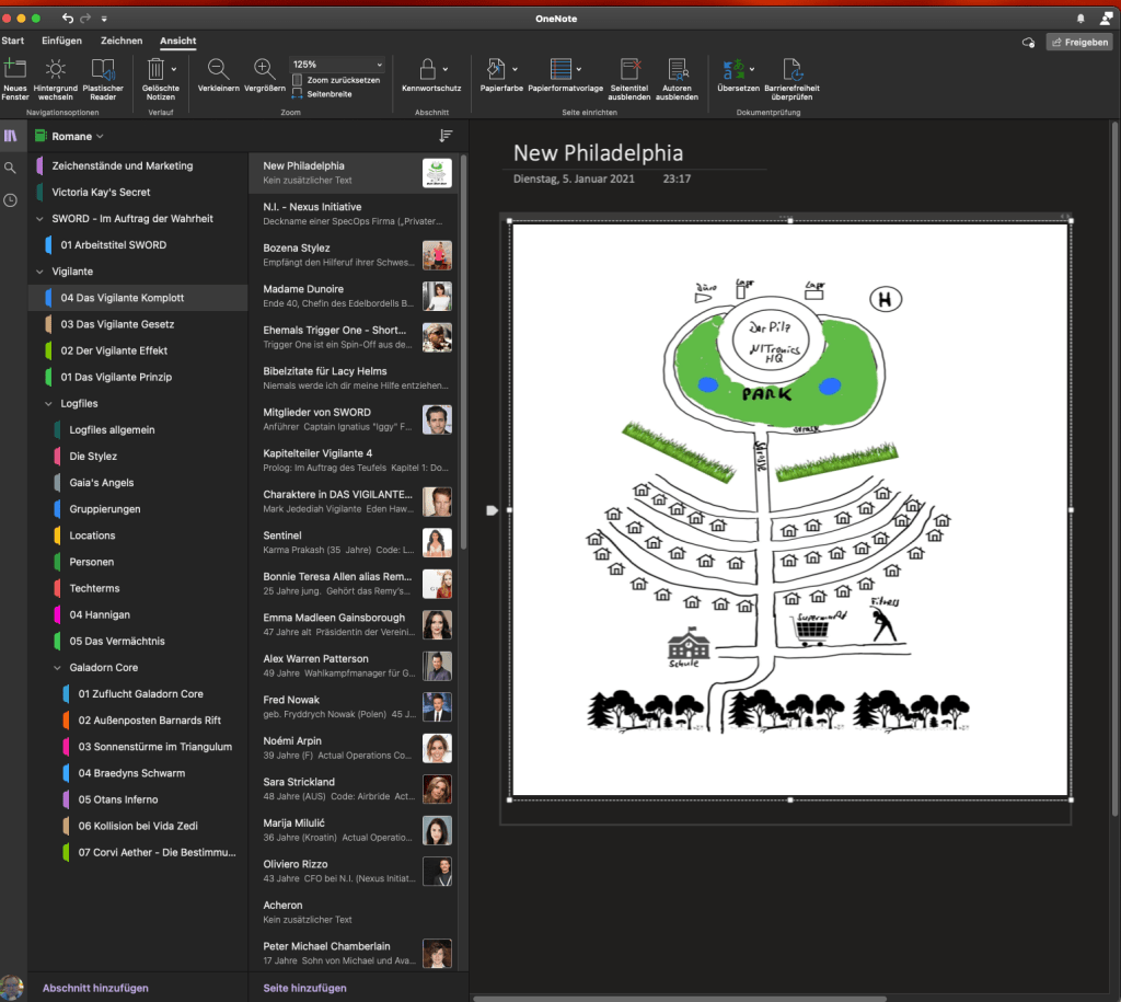 Leider gibt es einige bereichsübergreifende Notizbücher. Beispielsweise greife ich auf die Notizbücher von Vigilante 1 – 3 zu, wenn ich in 4 arbeite. Und ich brauche hin und wieder Notizen aus den Hannigan-Romanen, ebenfalls für die neue SWORD-Reihe, weil alles doch irgendwie zusammengehört.