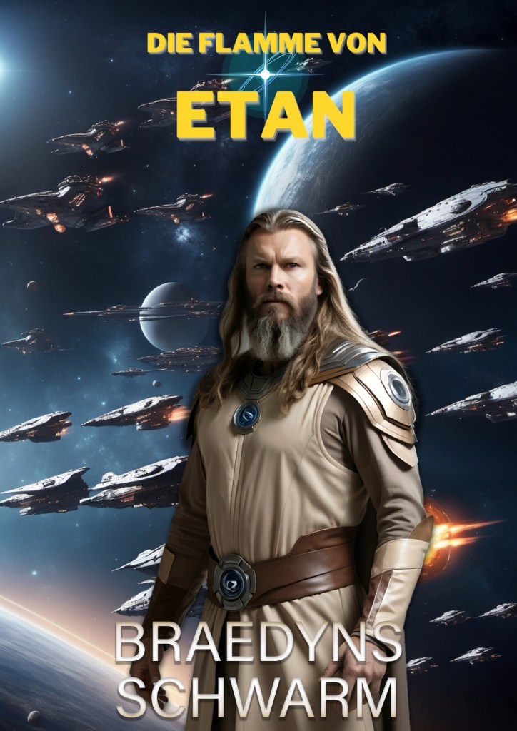 Als man mich früher nach einer Titelbildidee fragte, habe ich angefangen zu beschreiben, was mir vorschwebt. Später ging ich dazu über, in Photoshop collagenartig etwas zusammenzuschnipseln. Um Photoshop komme ich zwar immer noch nicht herum, weil mir keine KI ein „fertiges“ Titelbild ausspuckt, aber die Einzelelemente stammen allesamt von Stable Diffusion. Hier ein Beispiel für einen Coverentwurf für den vierten ETAN-Roman.