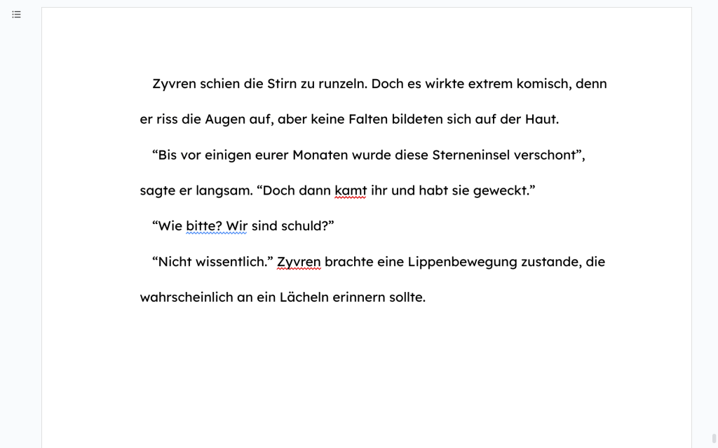 Also habe ich mein Manuskript in die GSuite geladen und dann meine Schreibanpassungen vorgenommen. Leider war dieses Experiment nicht so erfolgreich, wie ich es eigentlich in Erinnerung hatte.
